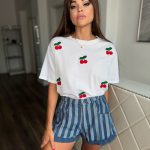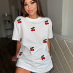 Fehér alapon plüssös cseresznyemintás, oversized póló: