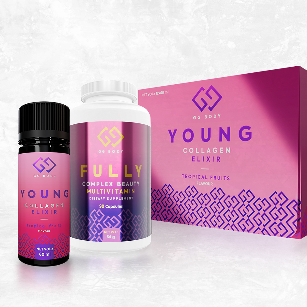 A csomag tartalma: 1 db GG Body YOUNG Collagen Elixir és  1 db GG Body FULLY Complex Beauty Multivitamin