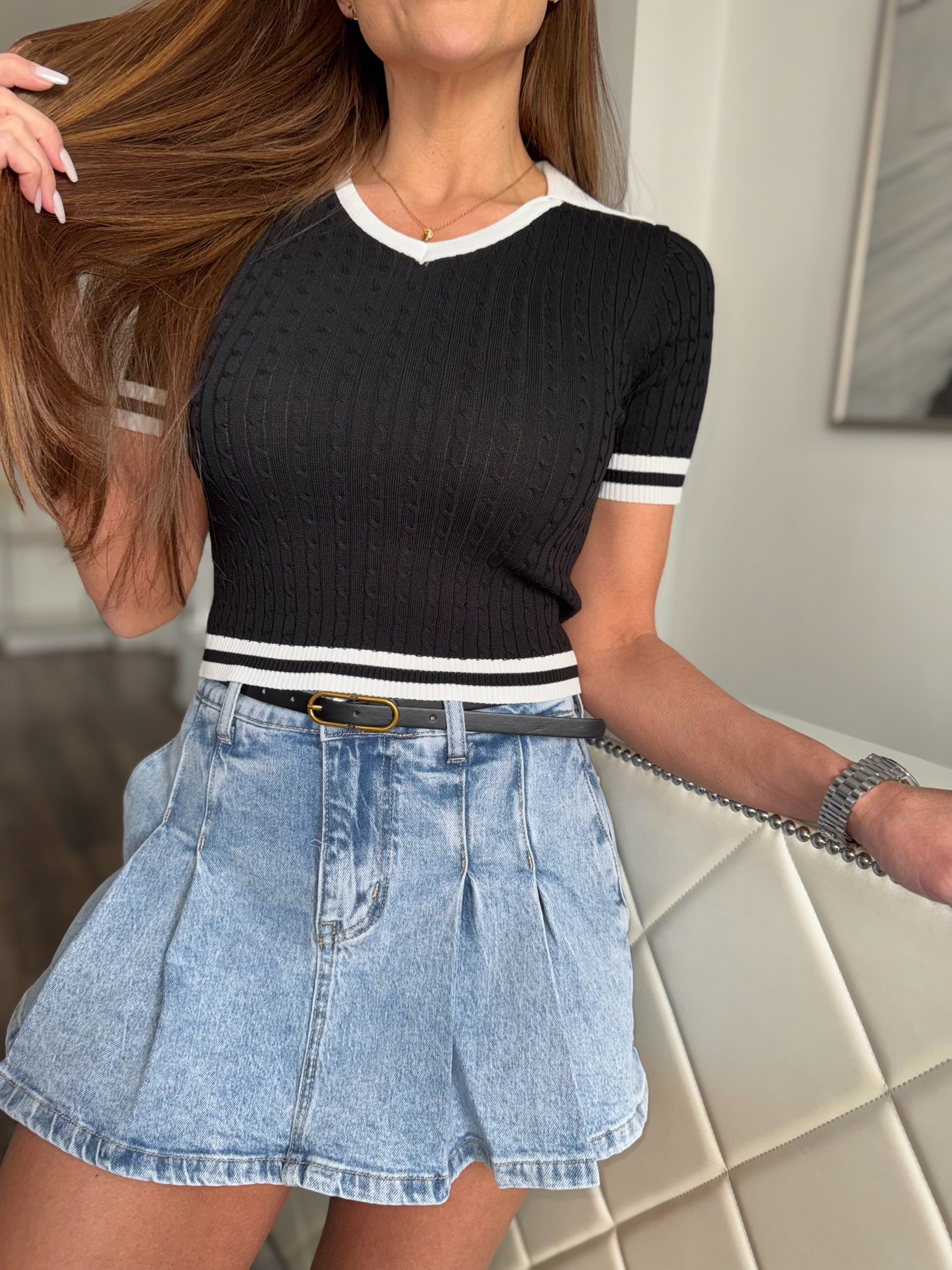 Fekete inggalléros, vékonykötött felső fehér csíkokkal:
