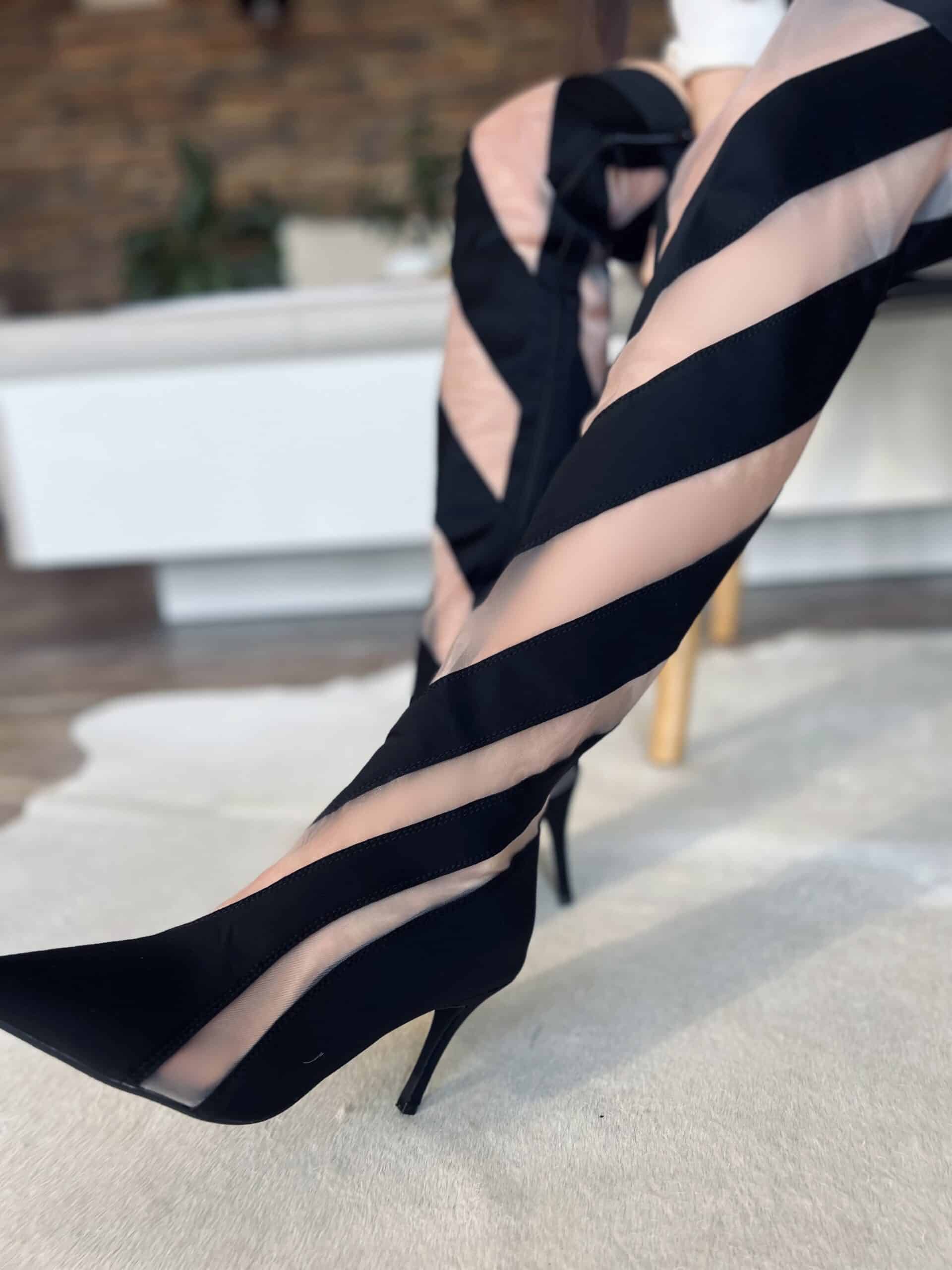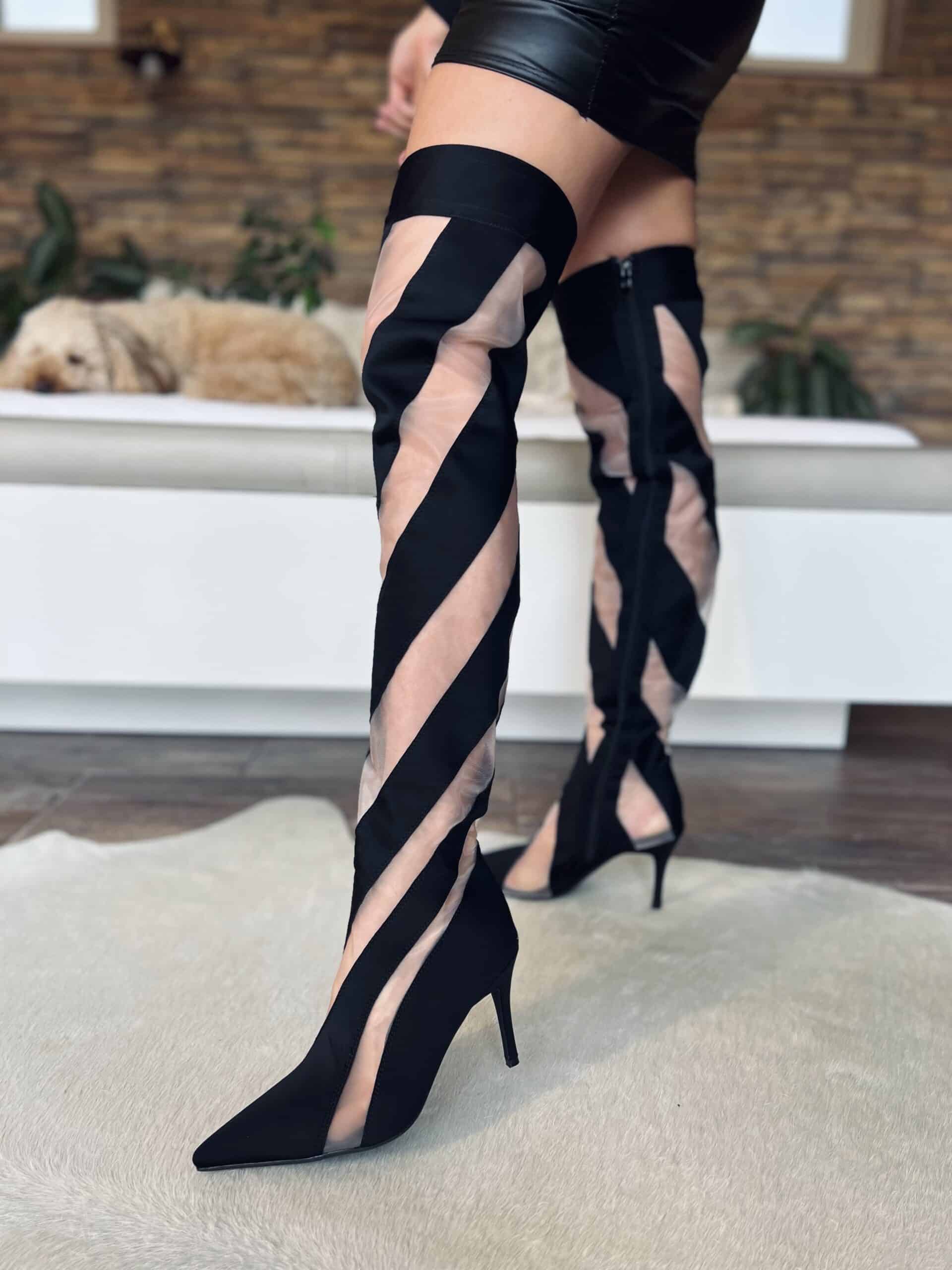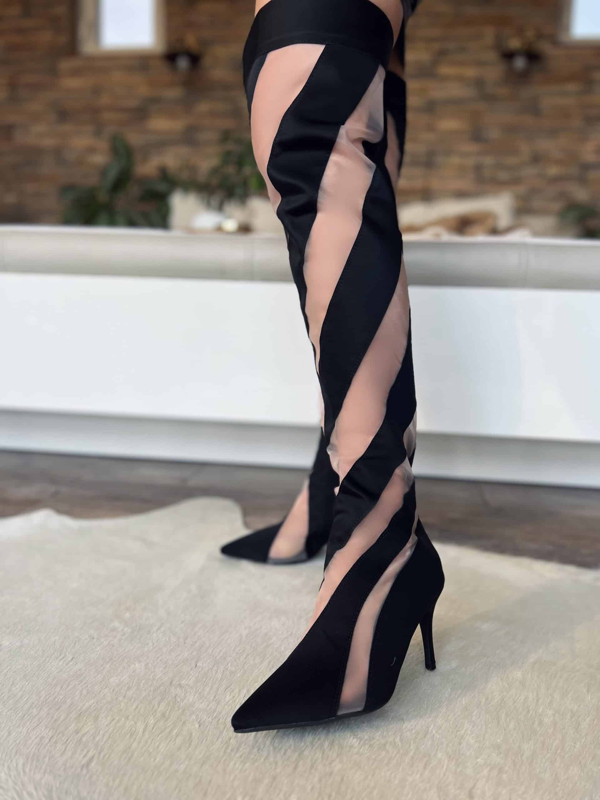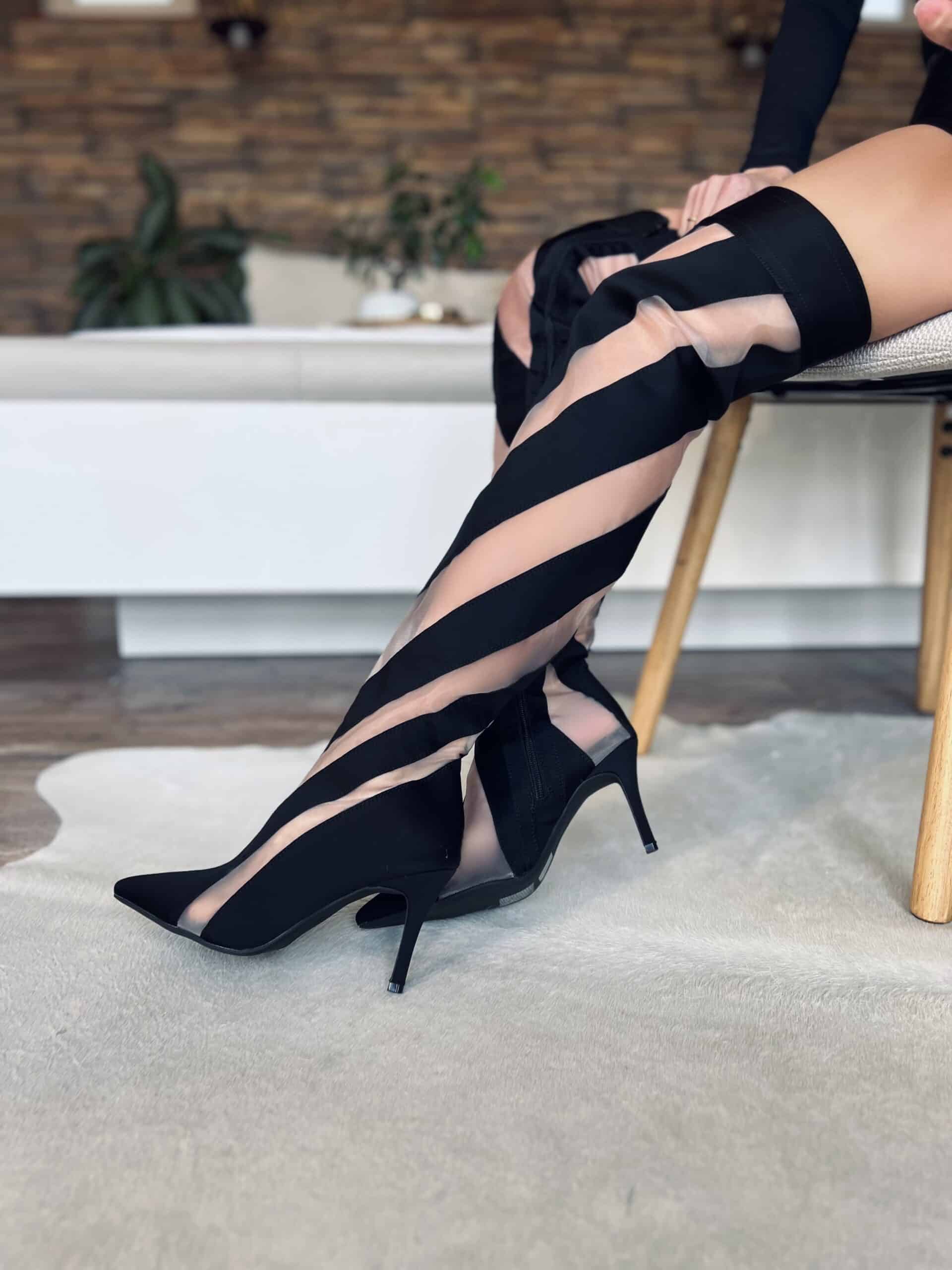 Fekete magassarkú csizma áttetsző tüllbetétekkel: