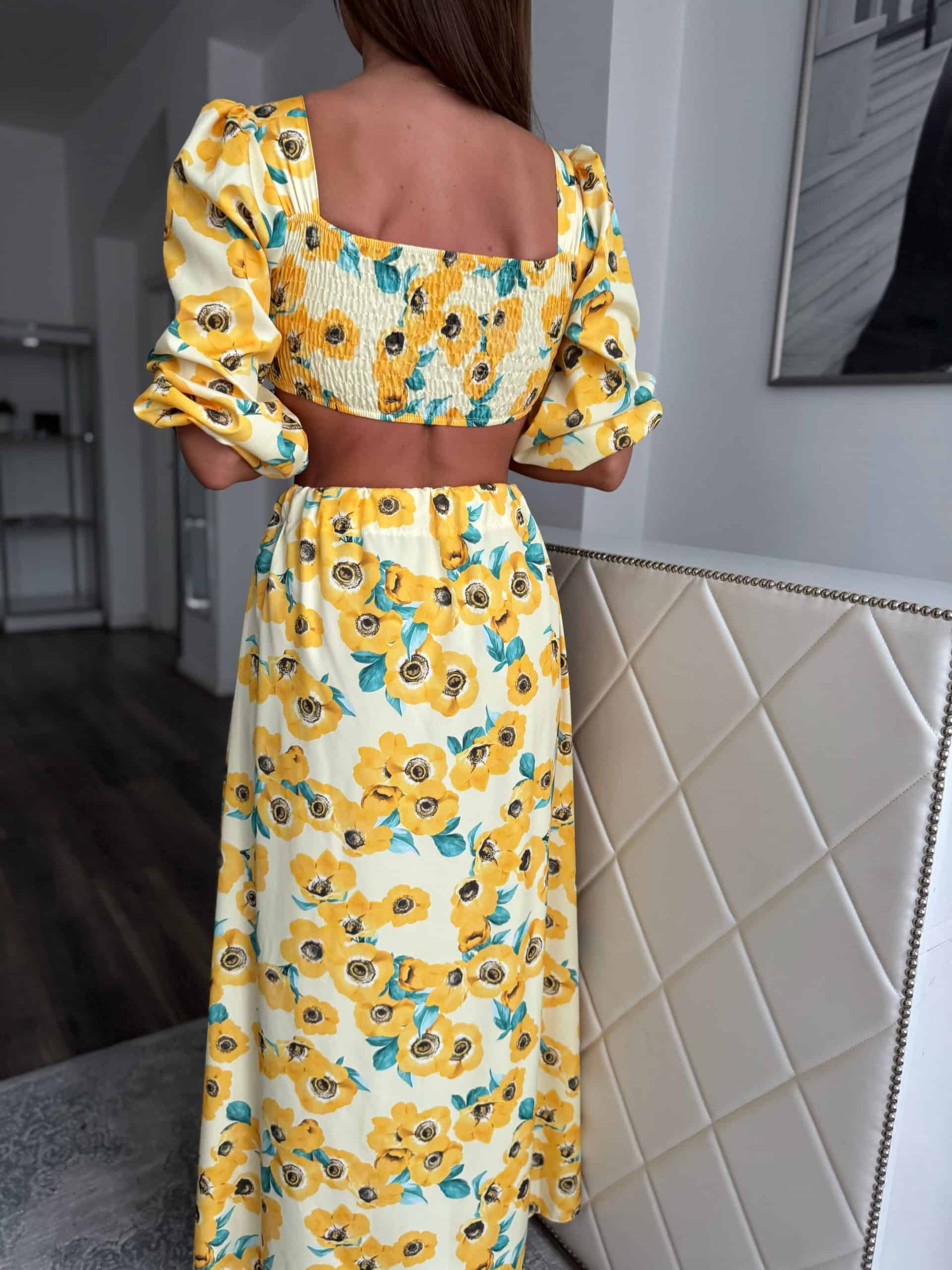 Halványsárga alapon napsárga virágmintás crop top és maxi szoknya szett: