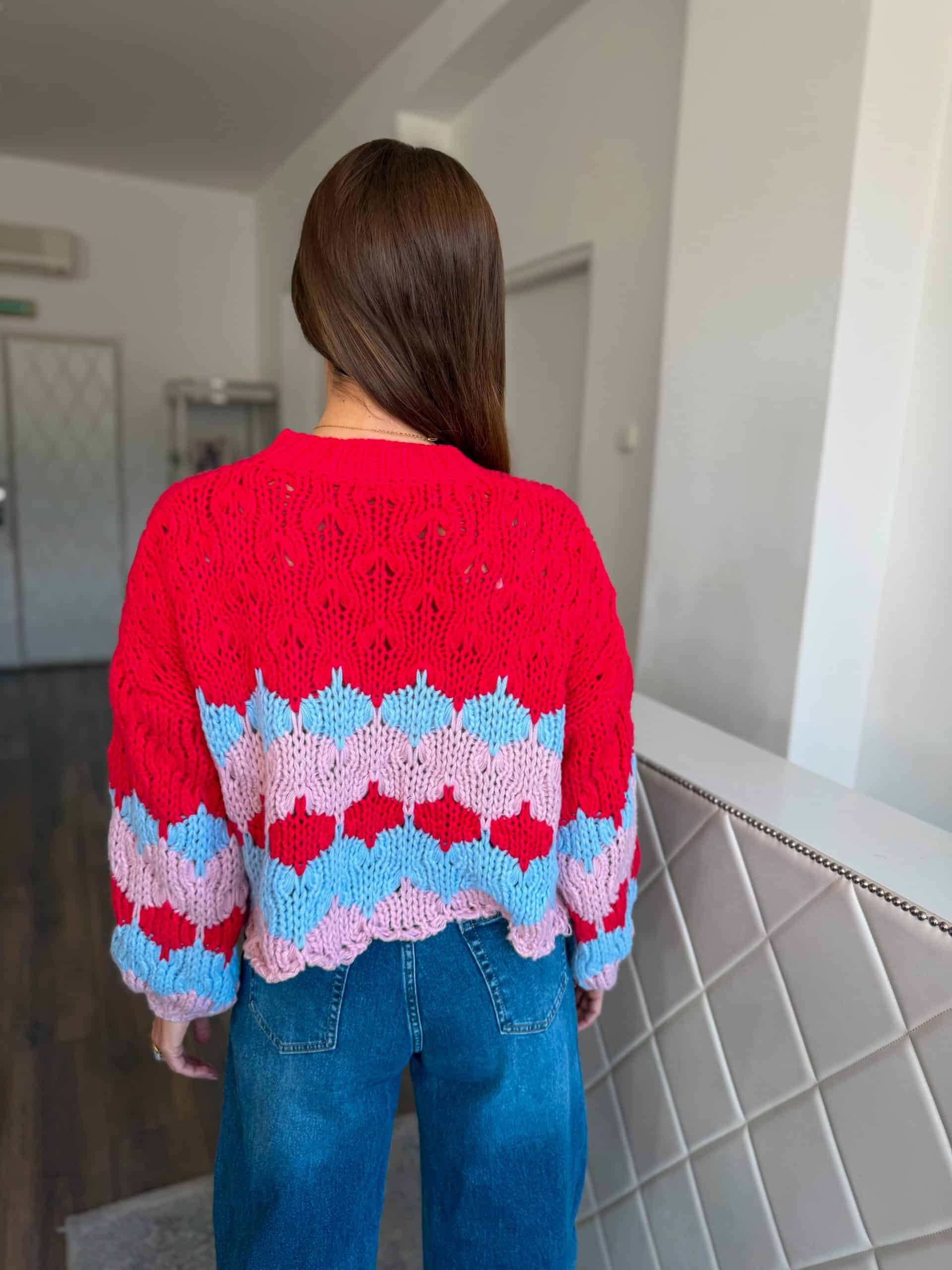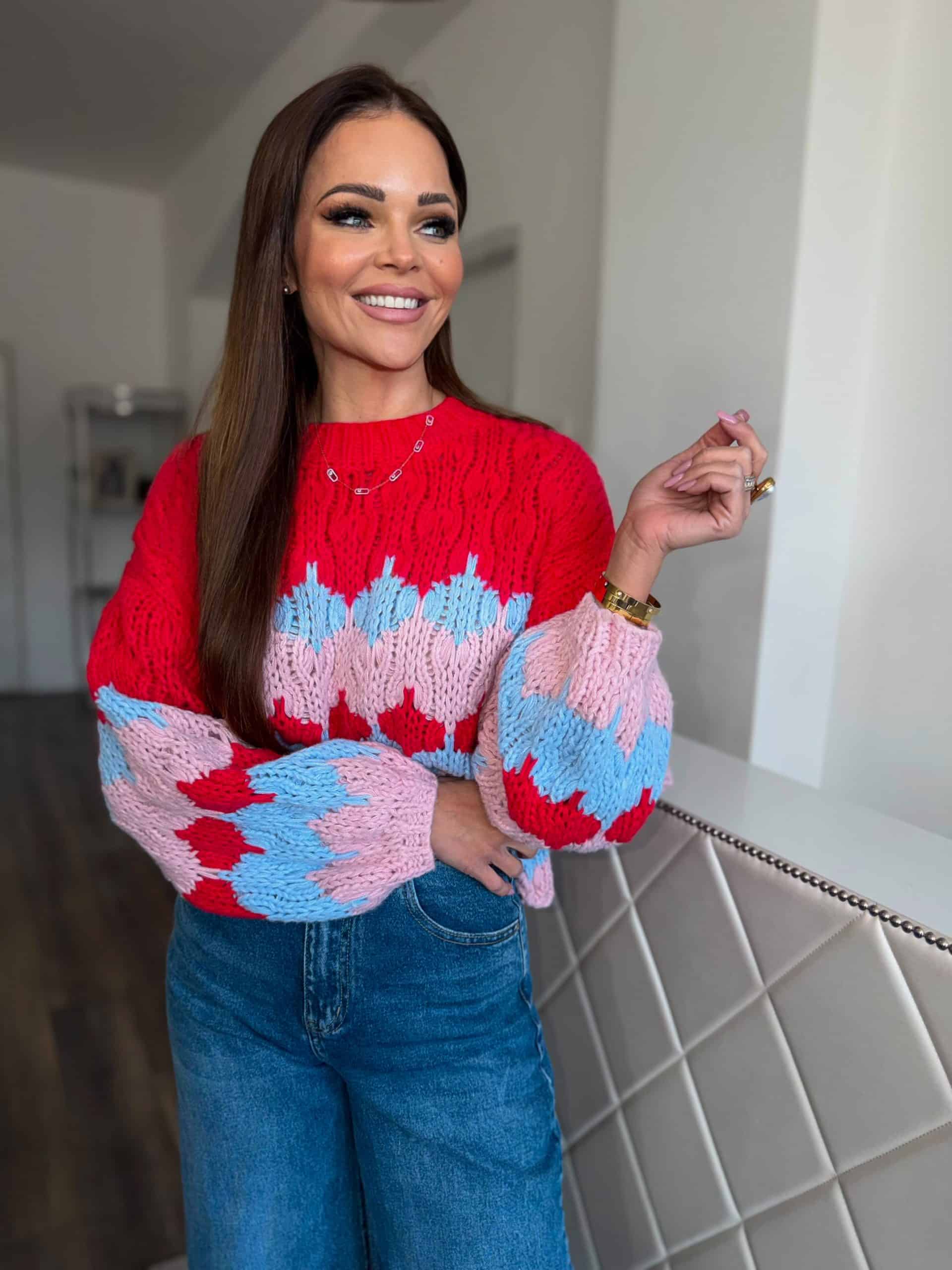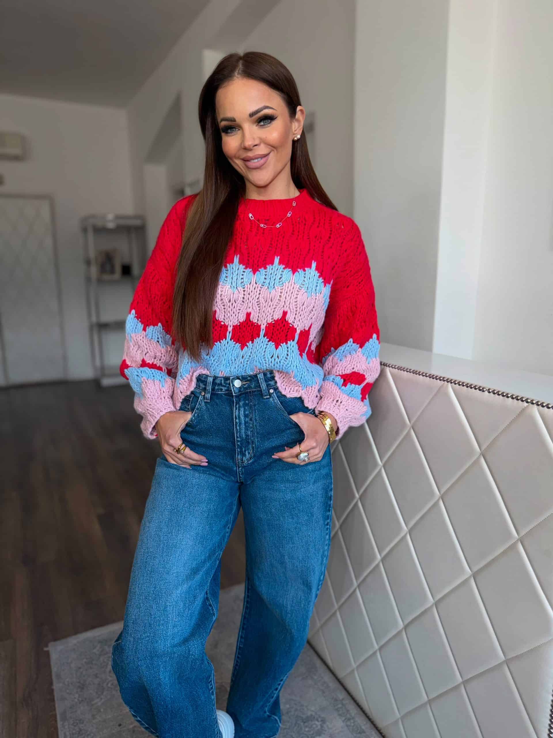 Élénkpiros, pasztell rózsaszín és világoskék vastag, kötött pulóver: