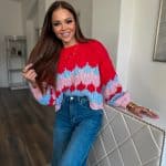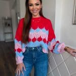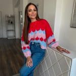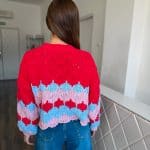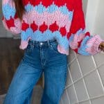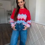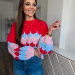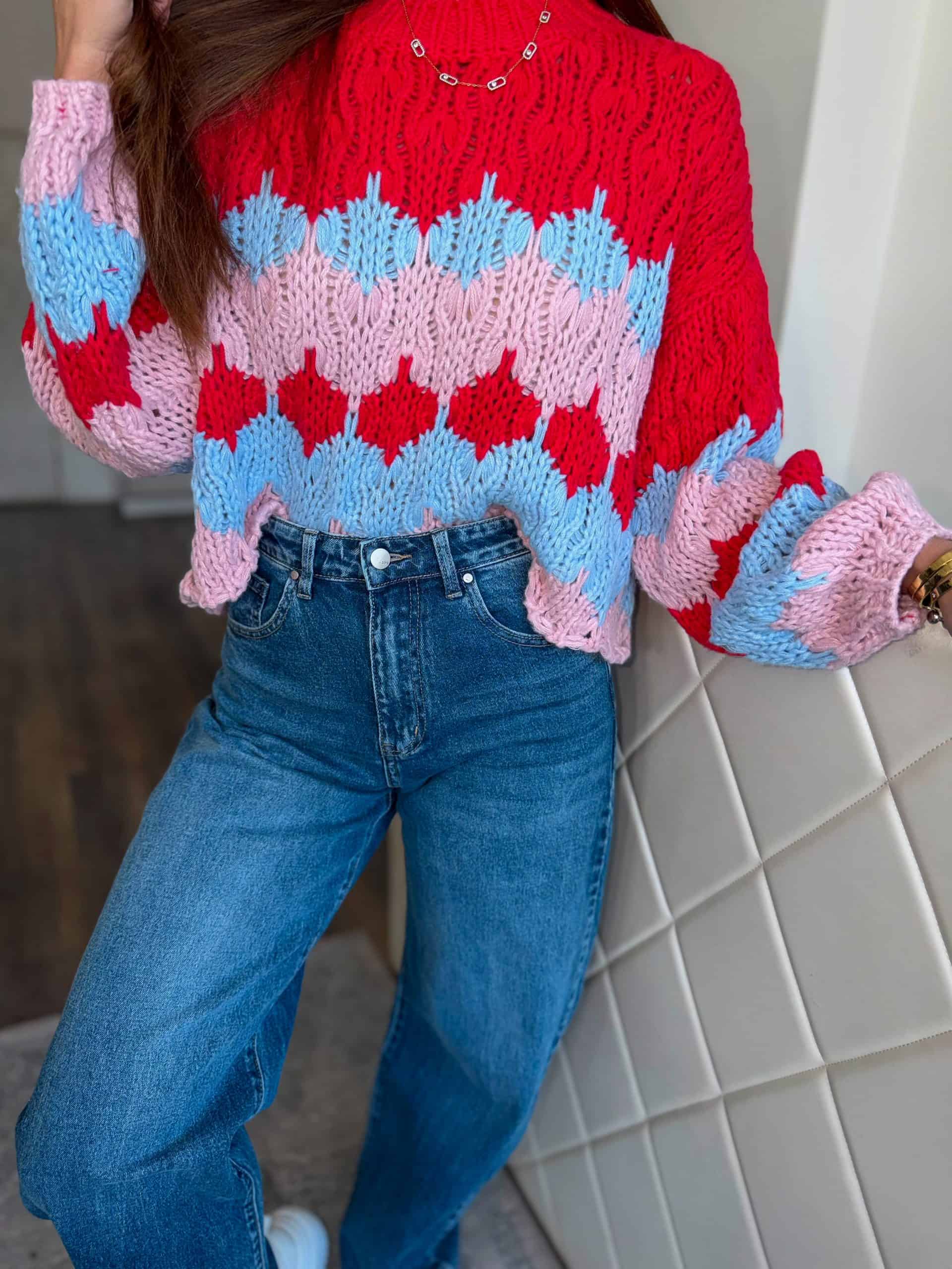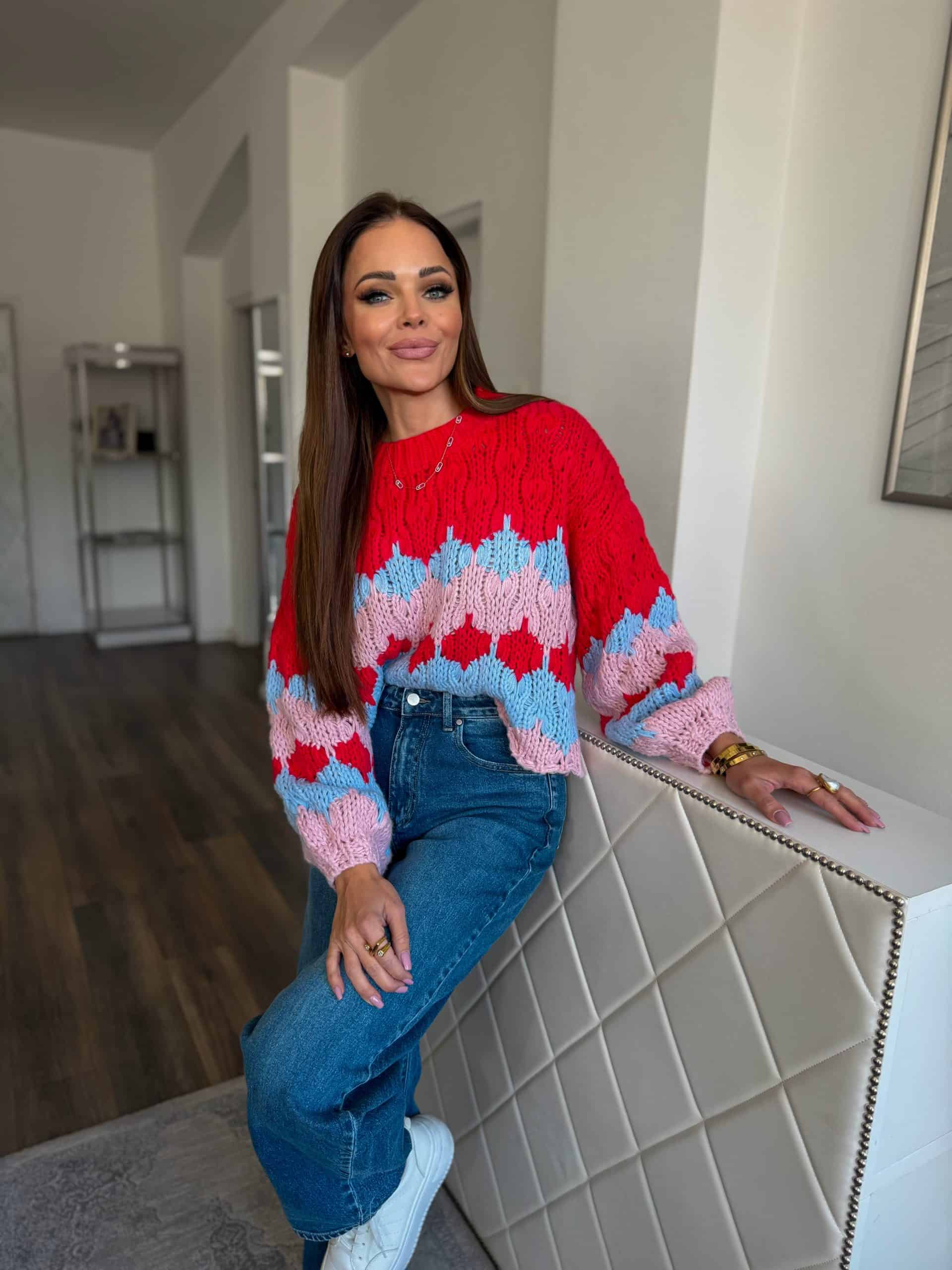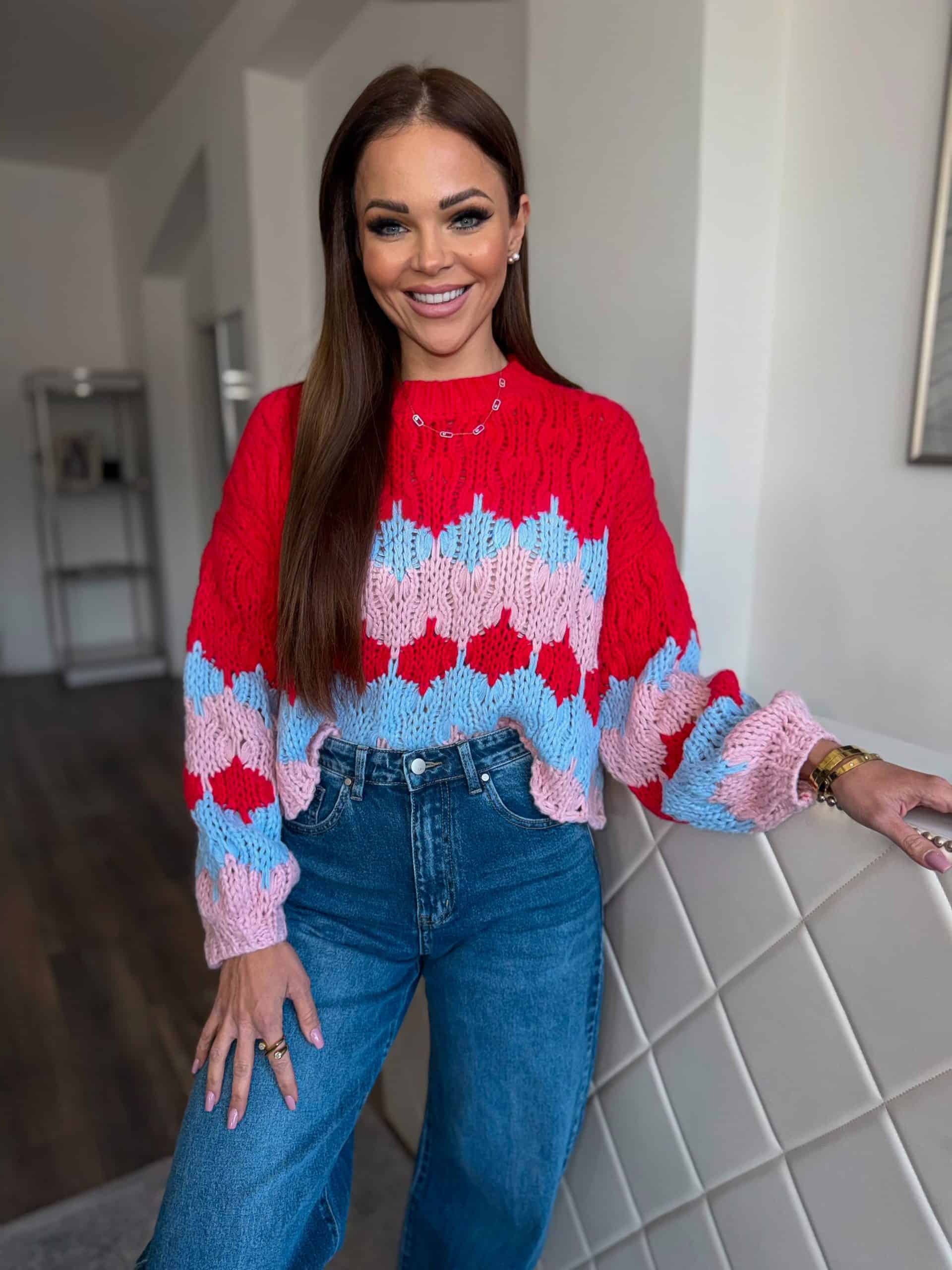 Élénkpiros, pasztell rózsaszín és világoskék vastag, kötött pulóver: