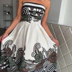 Törtfehér alapon fekete, barna és zöld mintás, vállnélküli midi ruha: