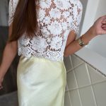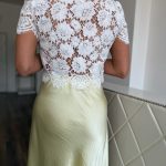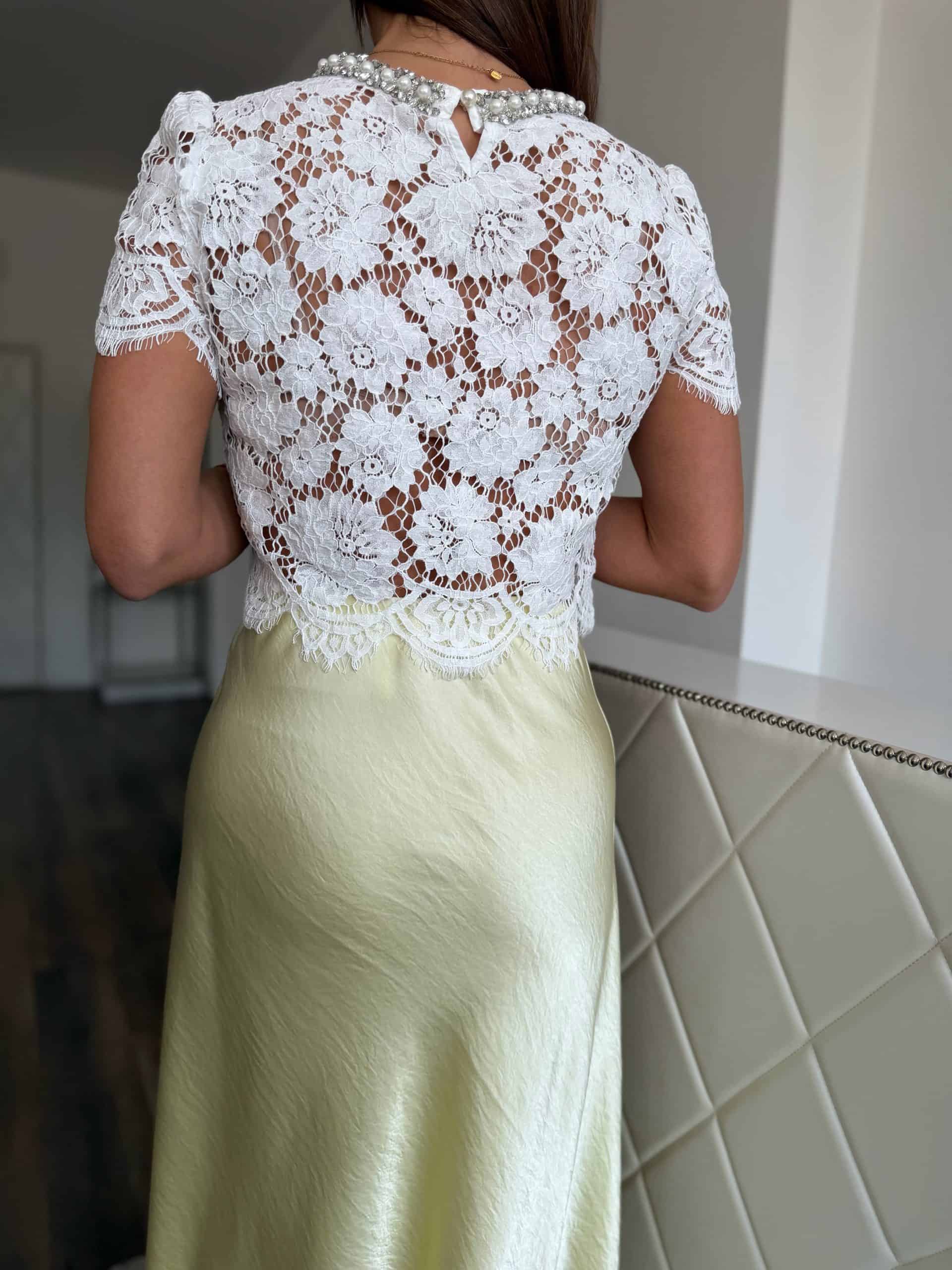 Fehér, csipke crop top strasszkövekkel és gyöngyökkel díszítve: