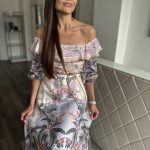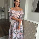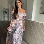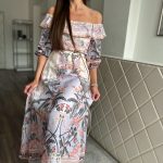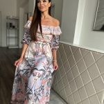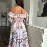 Lila és krémszínű alapon virágmintás, midi ruha: