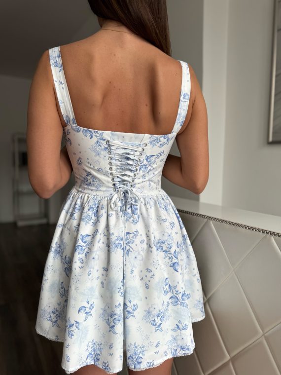 Fehér alapon kék virágmintás mini ruha: