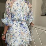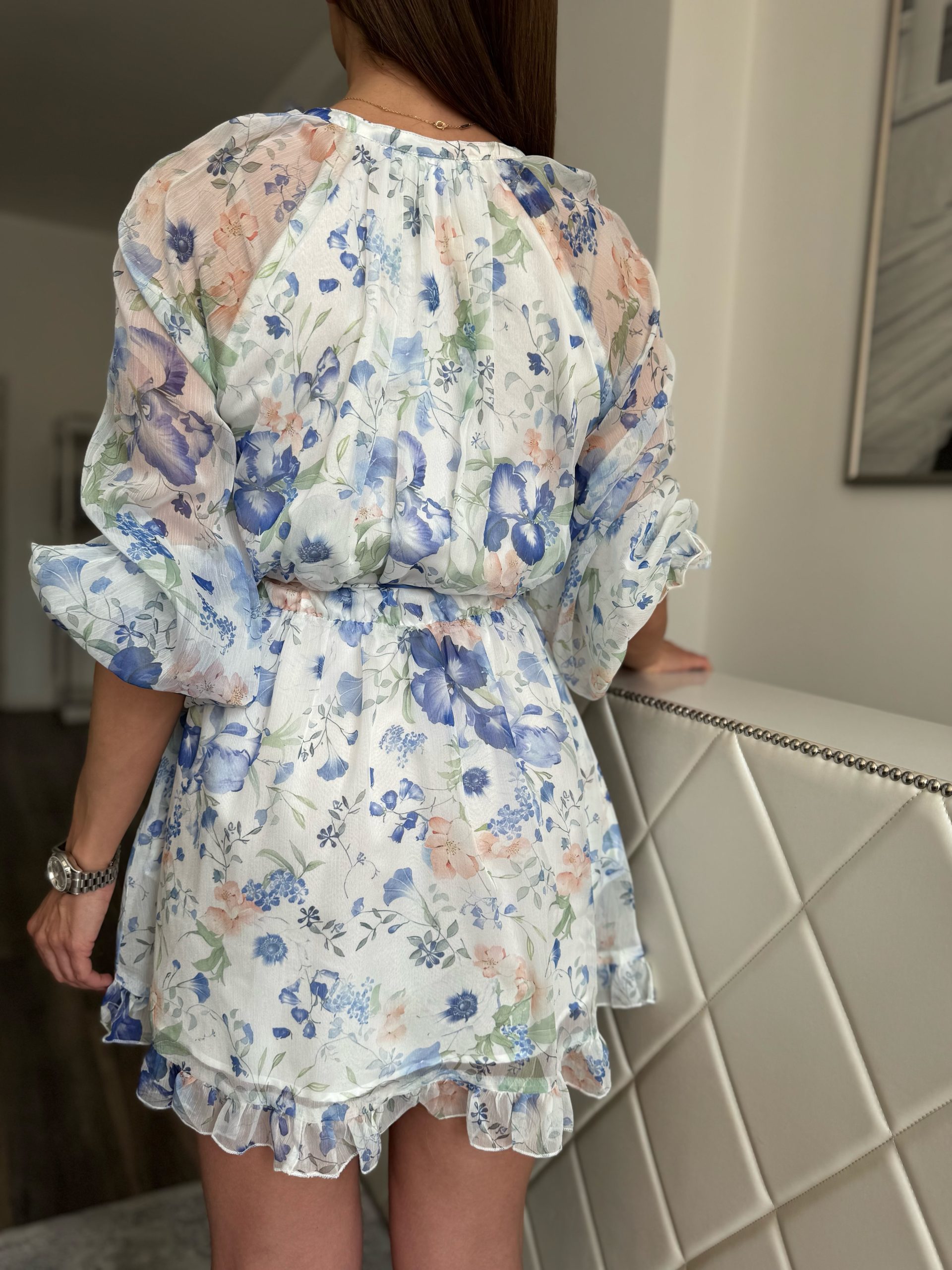 Fehér alapon kék és barackszínű virágmintás ruha: