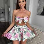 Krémszínű alapon rózsaszín virágmintás kendő/crop top, ing és nadrágszoknya szett: