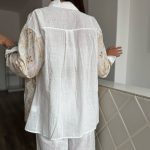 Fehér és bézs, rövid derekú top, ing és hosszú nadrág szett: