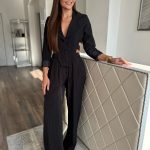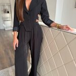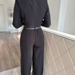 Fekete alapon fehér hajszálcsíkos cut-out blézer és hosszú nadrág szett: