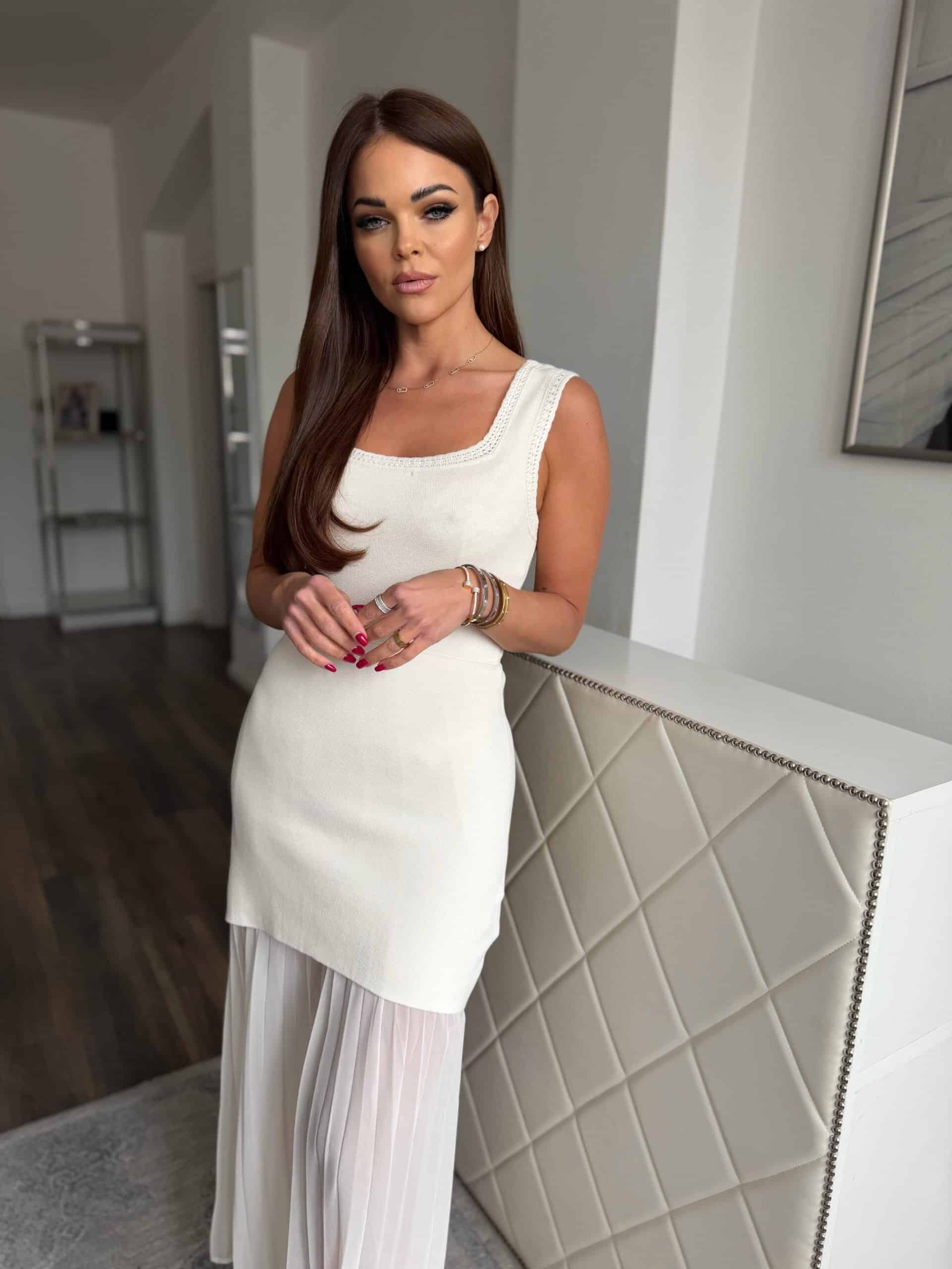 Krémes, meleg tónusú törtfehér pliszírozott ruha: